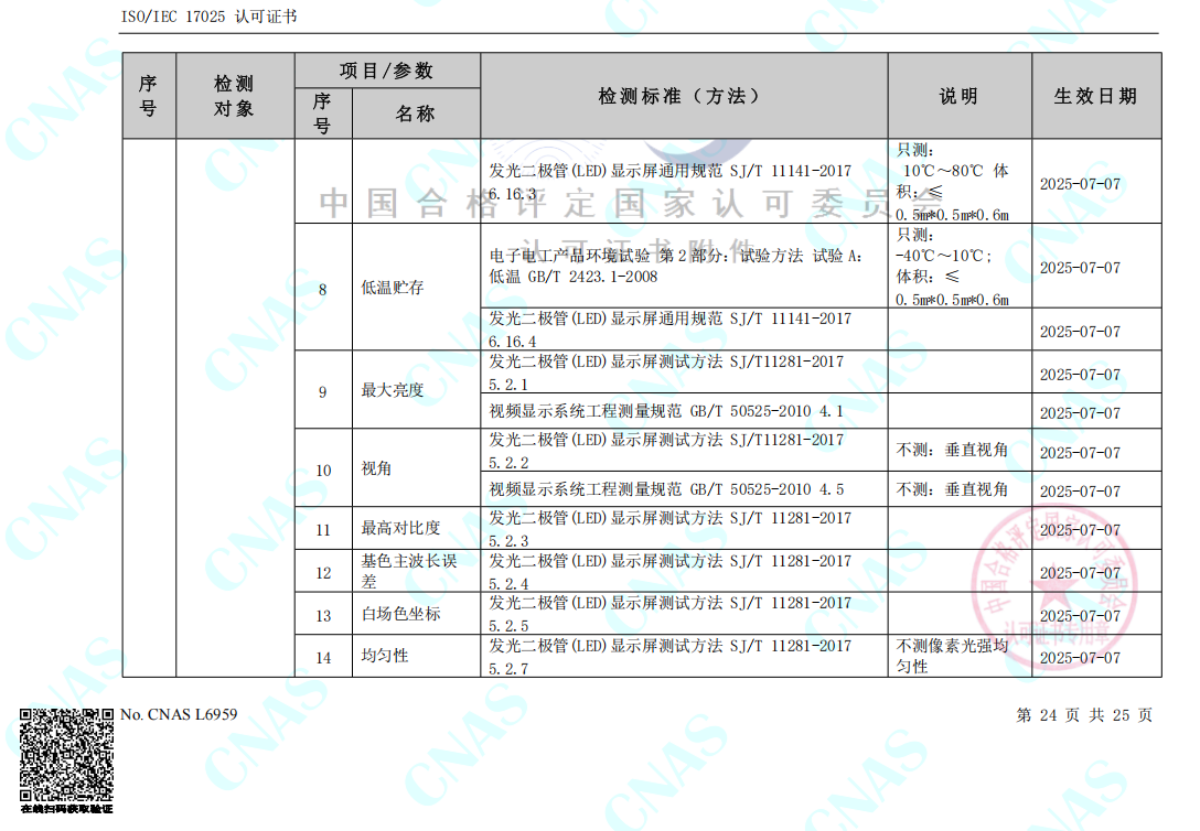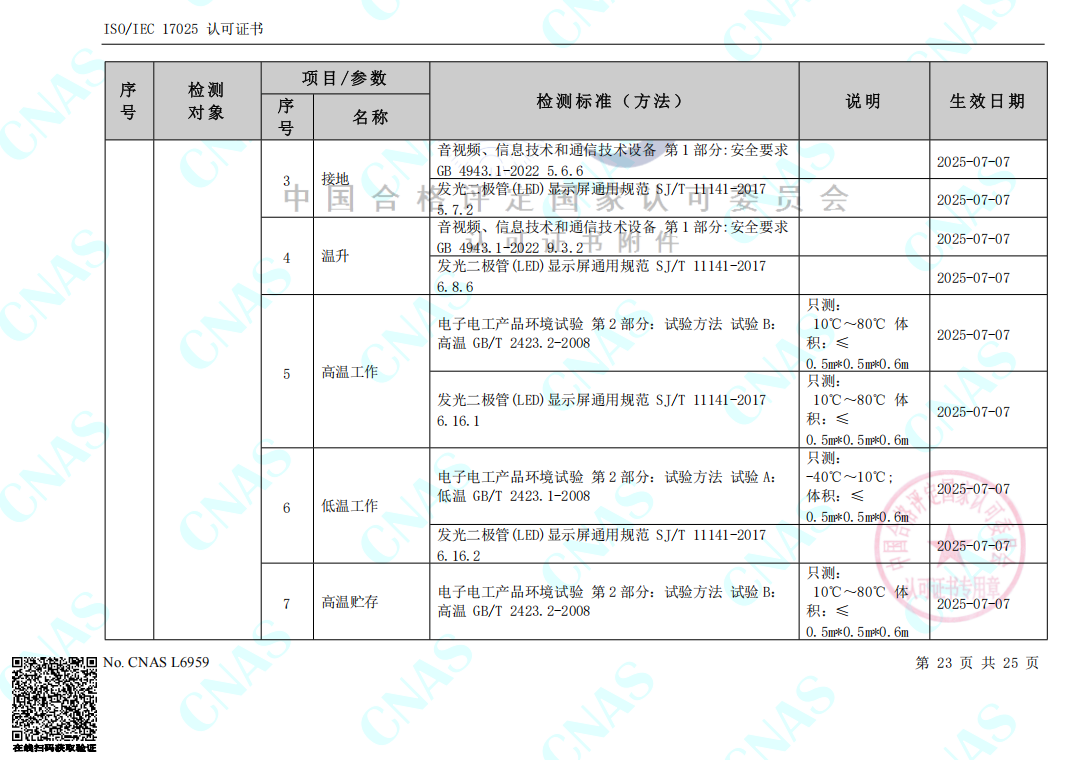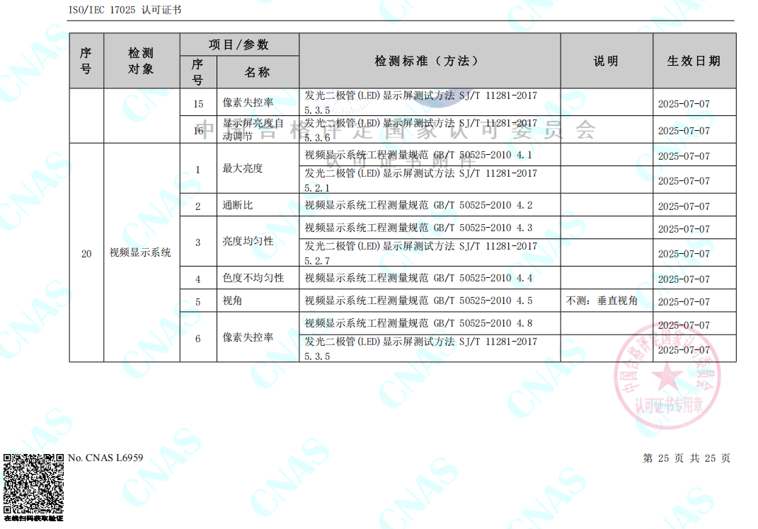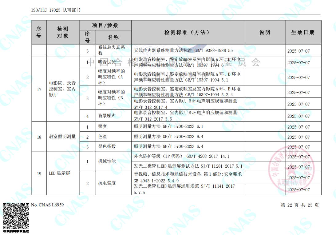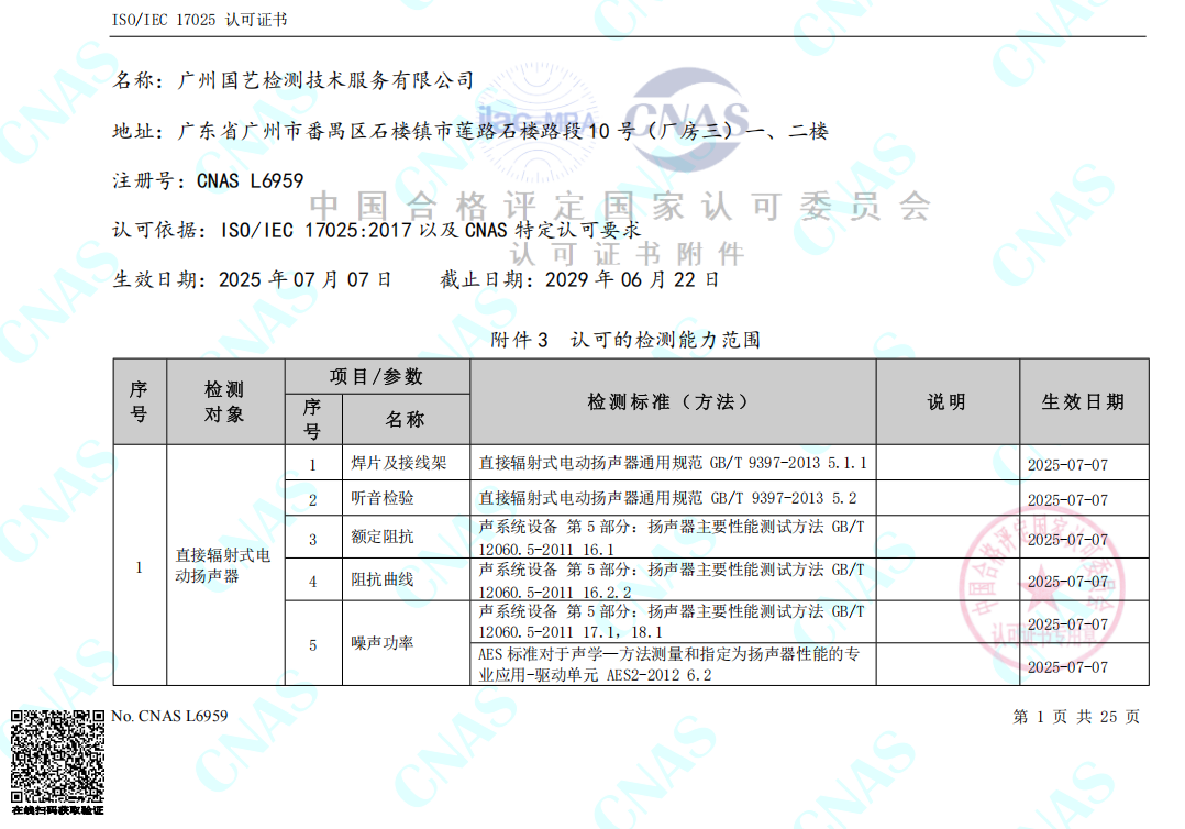 日前,廣州國藝檢測技術(shù)服務有限公司(簡稱國藝檢測)正式收到中國合格評定國家認可委員會頒發(fā)的證書編號:CNAS L6959,ISO/IEC 17025 認可證書以及認可的檢測能力范圍表,從2025年7月7日起,國藝檢測獲得涉及電聲產(chǎn)品檢測、環(huán)境試驗(高低溫)、外觀防護(最高IP66)、吊掛件拉力、安全特性(抗電強度+接地電阻)、廳堂擴聲、城市噪聲、建筑聲學、隔音量、體育場館、公共廣播系統(tǒng)、舞臺燈光系統(tǒng)、教室照明、電影院、LED顯示屏以及視頻顯示系統(tǒng)等20個領(lǐng)域的CNAS認可檢測資質(zhì),標志著國藝檢測正式發(fā)展成為聲光電系統(tǒng)集成一體化第三方檢測機構(gòu)。